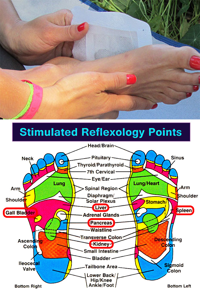 They may also be the easiest method, as you simply attach them to the arch of your foot (stimulating those reflexology points on the chart above) with an adhesive sheet, and throw them out in the morning.